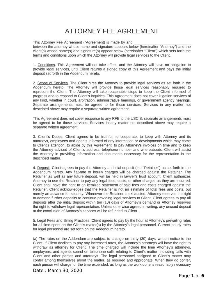 This Attorney Fee Agreement ("Agreement) is made by and between the attorney whose name and signature appears below (hereinafter "Attorney") and the client(s) whose name(s) and signature(s) appear below (hereinafter "Client" template instructions