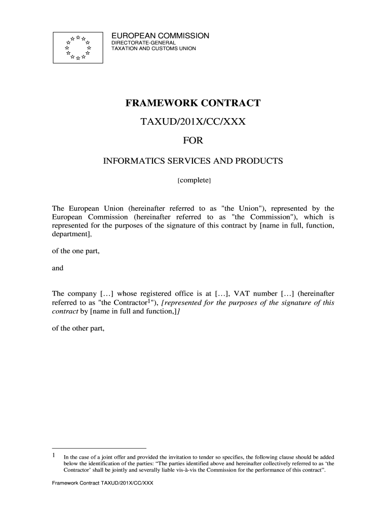 EUROPEAN COMMISSION DIRECTORATEGENERAL TAXATION AND CUSTOMS UNIONFRAMEWORK CONTRACT TAXED/201X/CC/XXX FOR INFORMATICS SERVICES AND PRODUCTS complete The European Union (hereinafter referred to as