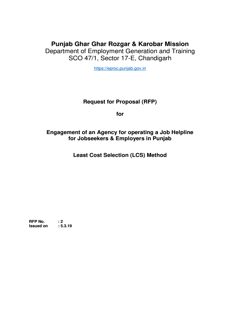 Punjab Gear Roger & Karo bar Mission Department of Employment Generation and Training SCO 47/1, Sector 17E, Chandigarh https://eproc.punjab.gov.inRequest for Proposal (RFP) engagement of an Agency
