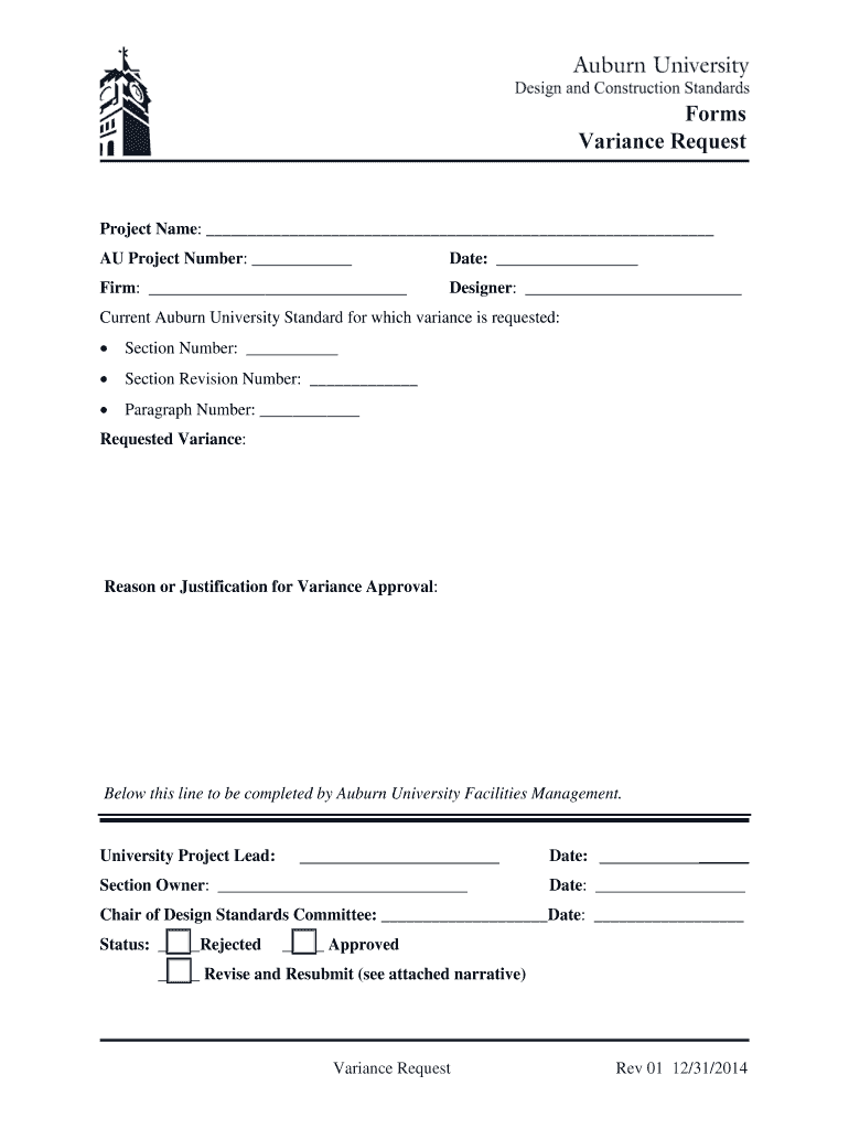 Form Forms Variance Request VarianceProject Name: AU Project Number: Date: Firm: Designer: Current Auburn University Standard for which variance is requested: Section Number: Section Revision Number: