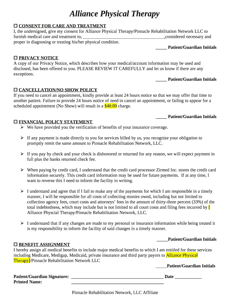Instructions for the form Advanced Physical Therapy - Alliance Physical Therapy