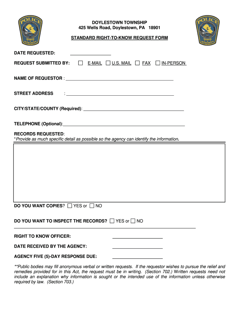 The Pennsylvania Right-to-Know Request Form is a government document used by citizens to request access to public records from Doylestown Township.