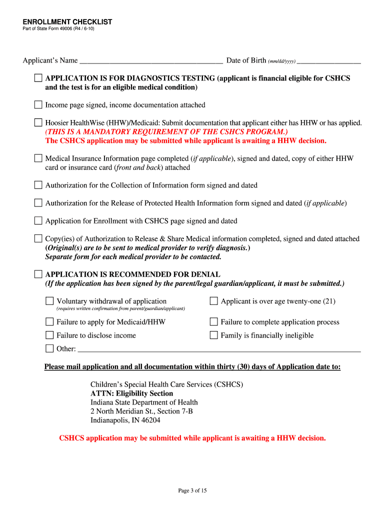 Get the free Indiana CSHCS Enrollment Application