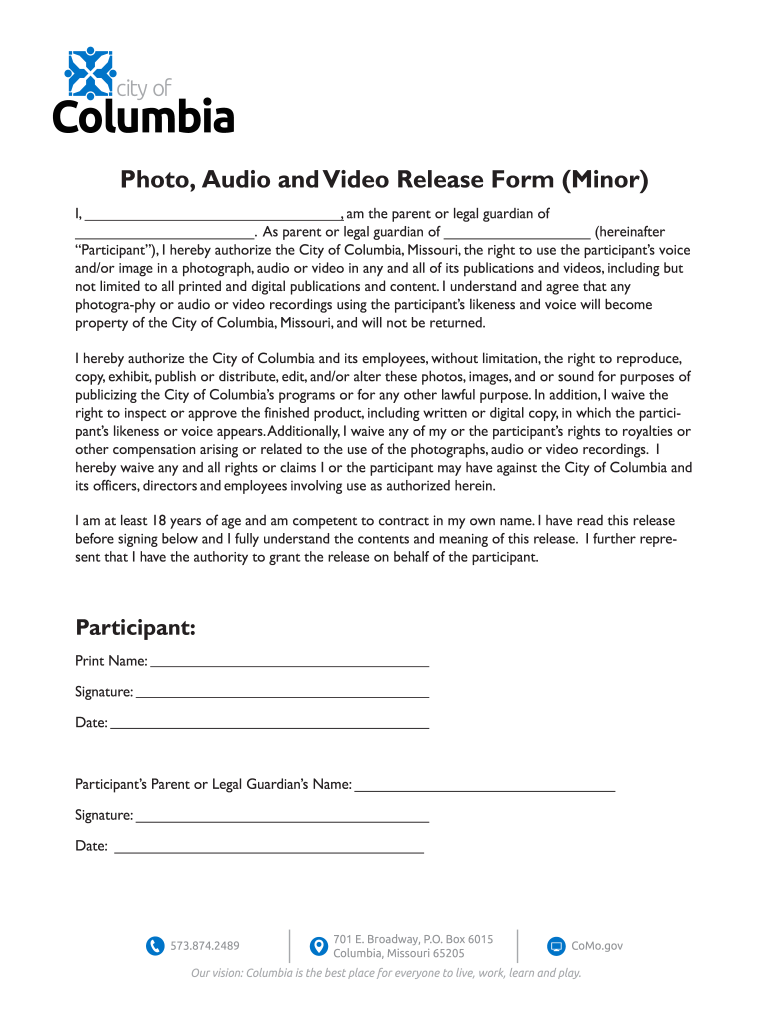 Photo, Audio and Video Release Form (Minor) I, am the parent or legal guardian of. As parent or legal guardian of (hereinafter Participant), I hereby authorize the City of Columbia, Missouri, the