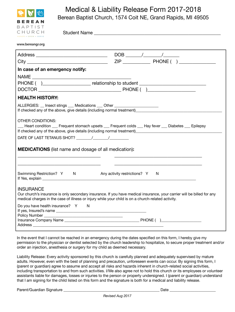 Medical & Liability Release Form 20172018Berean Baptist Church, 1574 Cost NE, Grand Rapids, MI 49505 Student Name Address City DOB / / ZIP PHONE () In case of an emergency notify: NAME PHONE () relationship