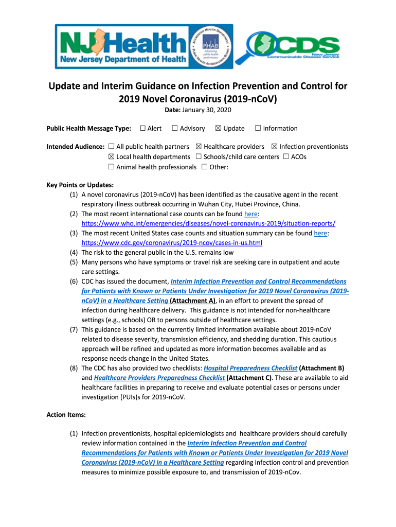 UpdateandInterimGuidanceonInfectionPreventionandControlfor 2019NovelCoronavirus(2019nCoV) Date:January30,2020 PublicHealthMessageType: AlertAdvisoryUpdateInformation IntendedAudience: Allpublichealthpartners