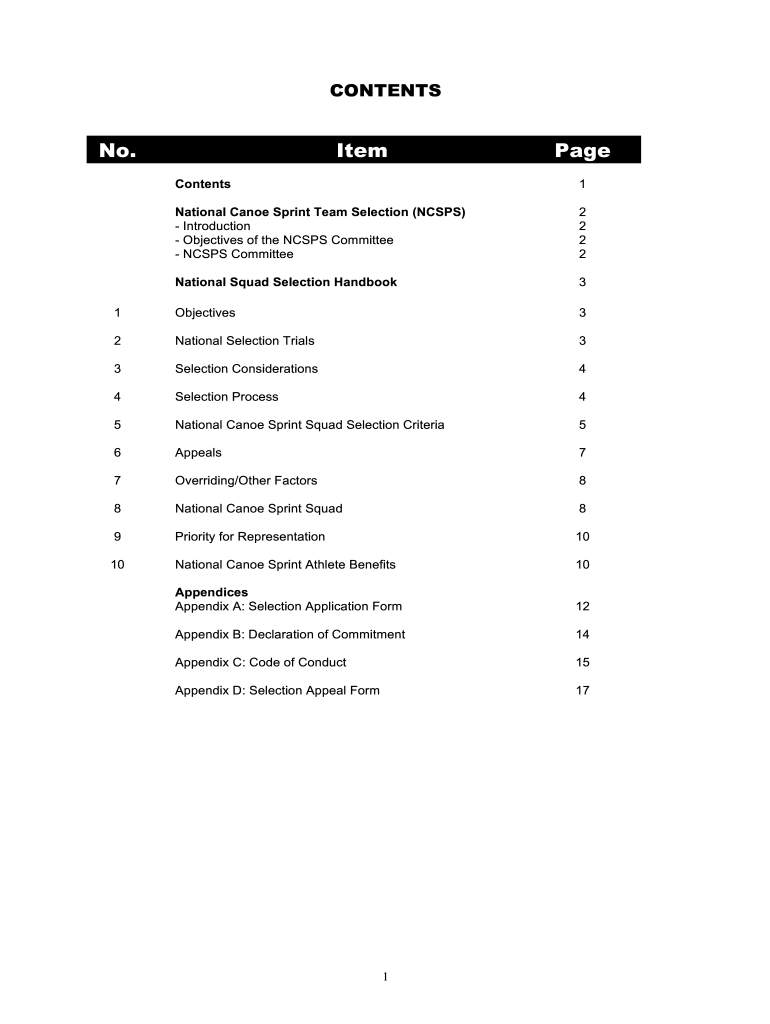 CONTENTS No. ItemPageContents1National Canoe Sprint Team Selection (CSPS) Introduction Objectives of the CSPS Committee CSPS Committee2 2 2 2National Squad Selection Handbook31Objectives32National