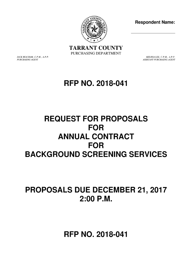 Respondent Name: TARRANT COUNTY PURCHASING DEPARTMENT JACK BEA CHAM, C.P.M., A.P.P. PURCHASING AGENTMELISSA LEE, C.P.M., A.P.P. ASSISTANT PURCHASING AGENT RFP NO. 2018041REQUEST FOR PROPOSALS FOR
