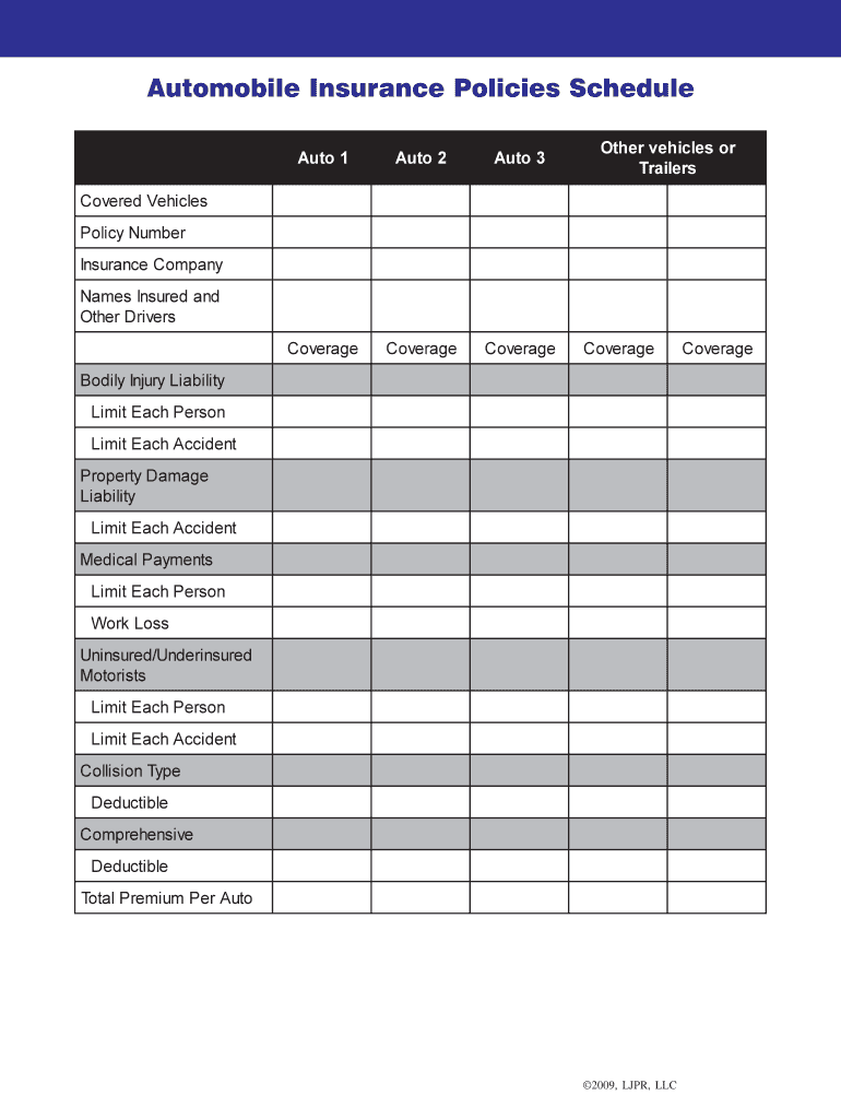 This schedule encompasses essential fields necessary for effective record-keeping. Key components include the Policy Number, Insurance Company, Coverage Limits, and Deductibles.