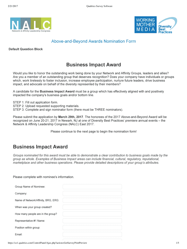 2/21/2017Qualtrics Survey SoftwareAboveandBeyondAwardsNominationForm DefaultQuestionBlock BusinessImpactAward WouldyouliketohonortheoutstandingworkbeingdonebyyourNetworkandAffinityGroups, leadersandallies?