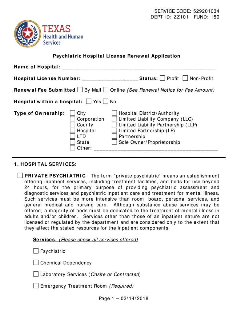SERVICE CODE: 529201034DEPT ID: ZZ101 FUND: 150Psychiatric Hospital License Renewal Application Name of Hospital: Hospital License Number: Status: Renewal Fee Submitted MailHospital within a hospital: