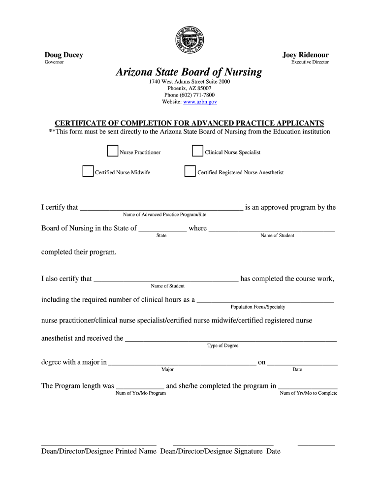 Doug DuceyJoey RidenourGovernorExecutive Director Arizona State Board of Nursing 1740 West Adams Street Suite 2000 Phoenix, AZ 85007 Phone (602) 7717800 Website: www.azbn.govCERTIFICATE OF COMPLETION
