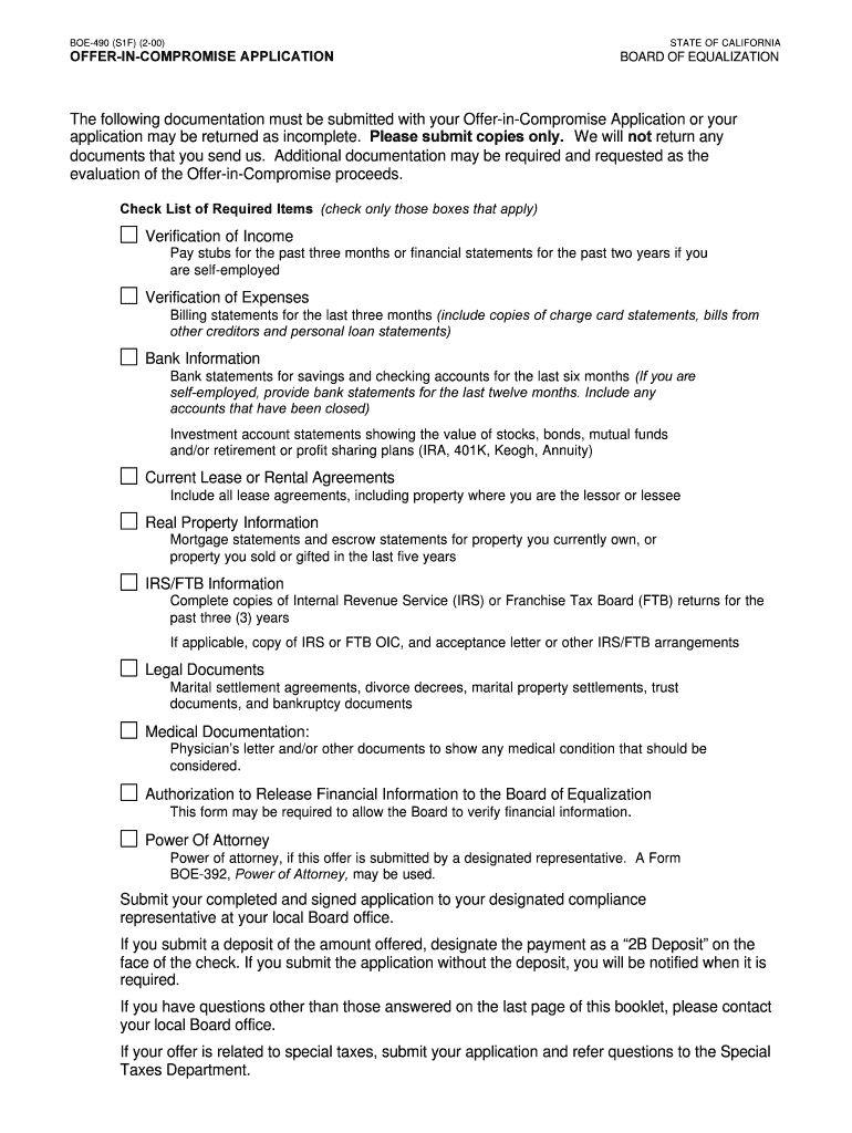 The completed California Offer-in-Compromise Application should be submitted to your local Board office. It may be necessary to include a deposit along with your application depending on your situation.