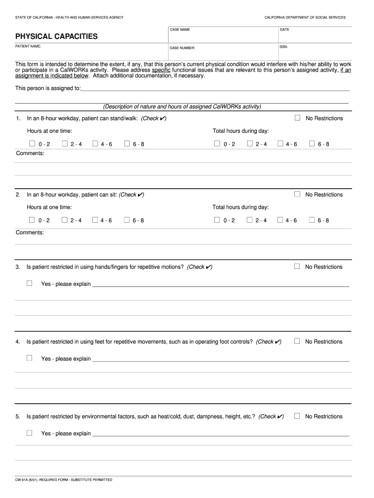 The California Physical Capacities Form consists of several key components that aid in its effective utilization. Major features include assessments of: