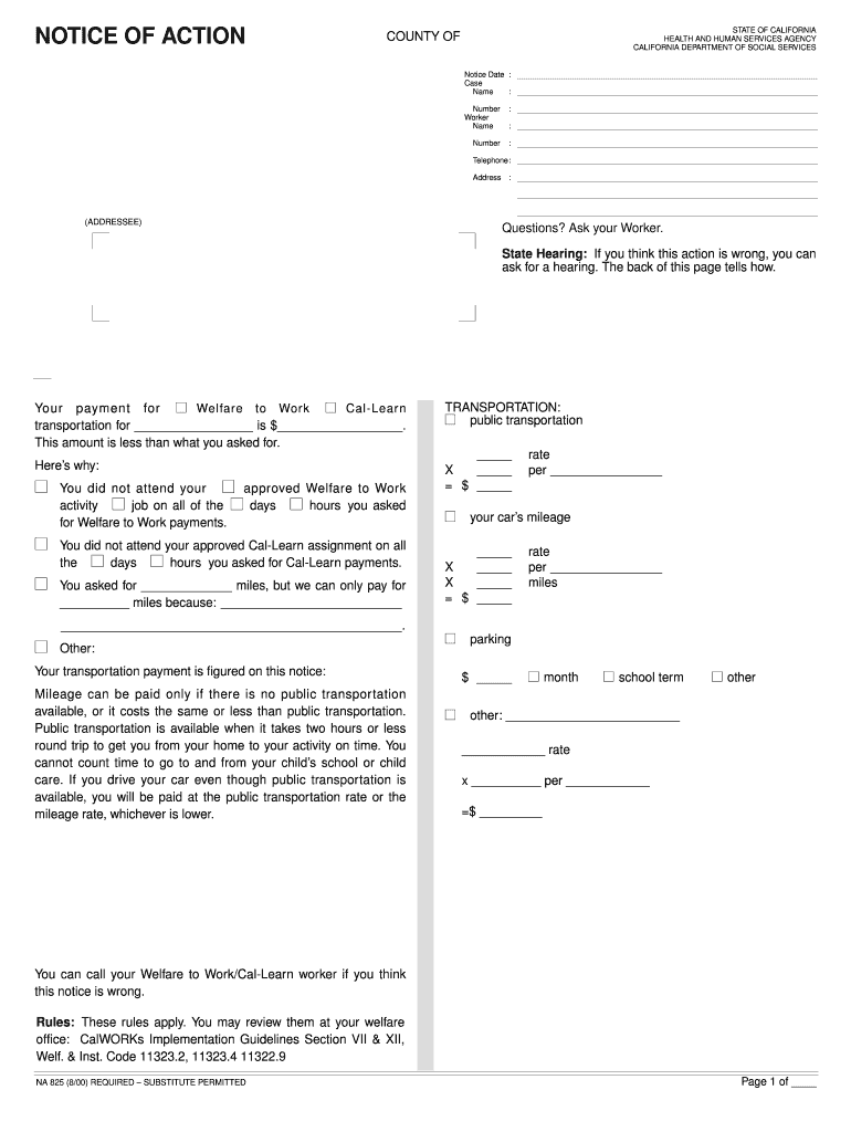 Get the free NA 825 (8/00) - Notice Of Action - Payment Adjust Transportation - dss cahwnet