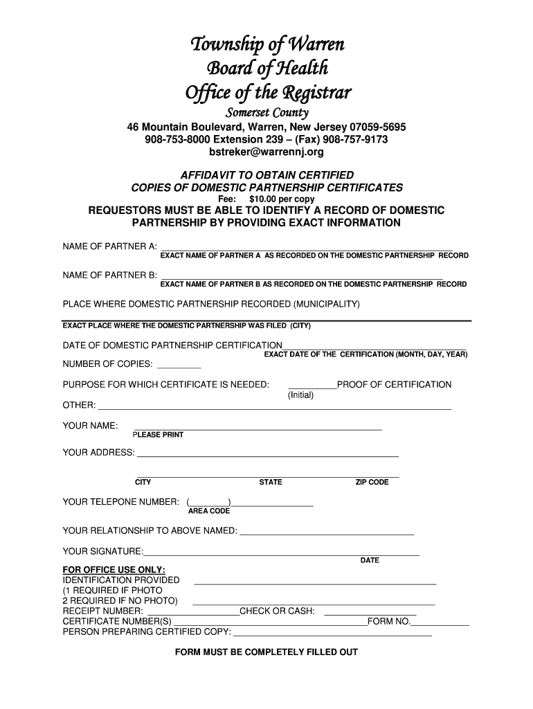 Township of Warren Board of Health Office of the Registrar Somerset County 46 Mountain Boulevard, Warren, New Jersey 070595695 9087538000 Extension 239 (Fax) 9087579173 striker Warren.org AFFIDAVIT