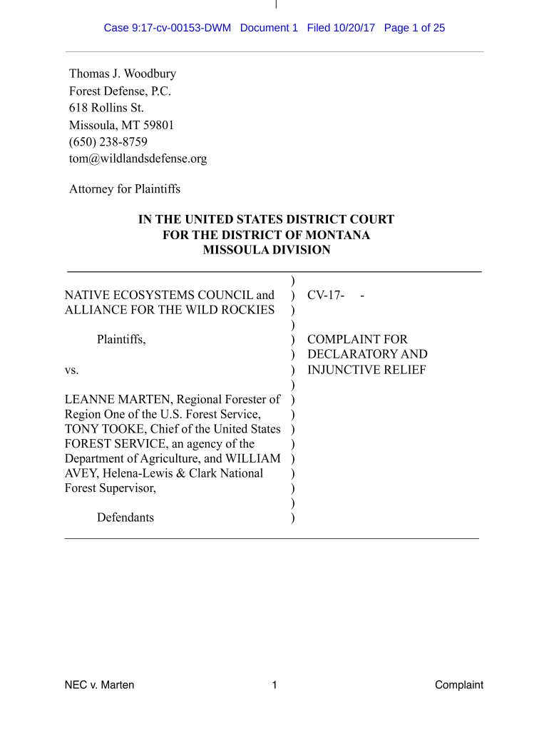Case 9:17cv00153DWM Document 1 Filed 10/20/17-Page 1 of 25Thomas J. Woodbury Forest Defense, P.C. 618 Rollins St. Missoula, MT 59801 (650) 2388759 tom wildlandsdefense.org Attorney for Plaintiffs
