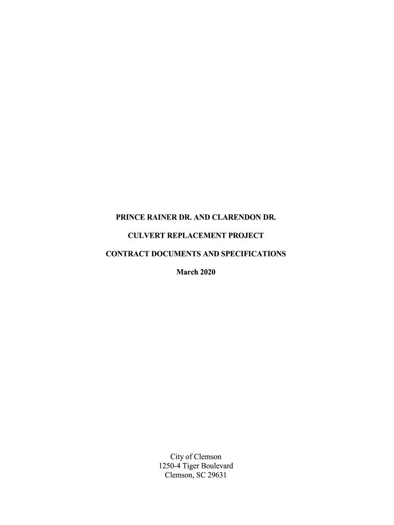 PRINCE TRAINER DR. AND CLARENDON DR. CULVERT REPLACEMENT PROJECT CONTRACT DOCUMENTS AND SPECIFICATIONS March 2020City of Clemson 12504 Tiger Boulevard Clemson, SC 29631TABLE OF CONTENTS SECTIONDESCRIPTIONPAGE