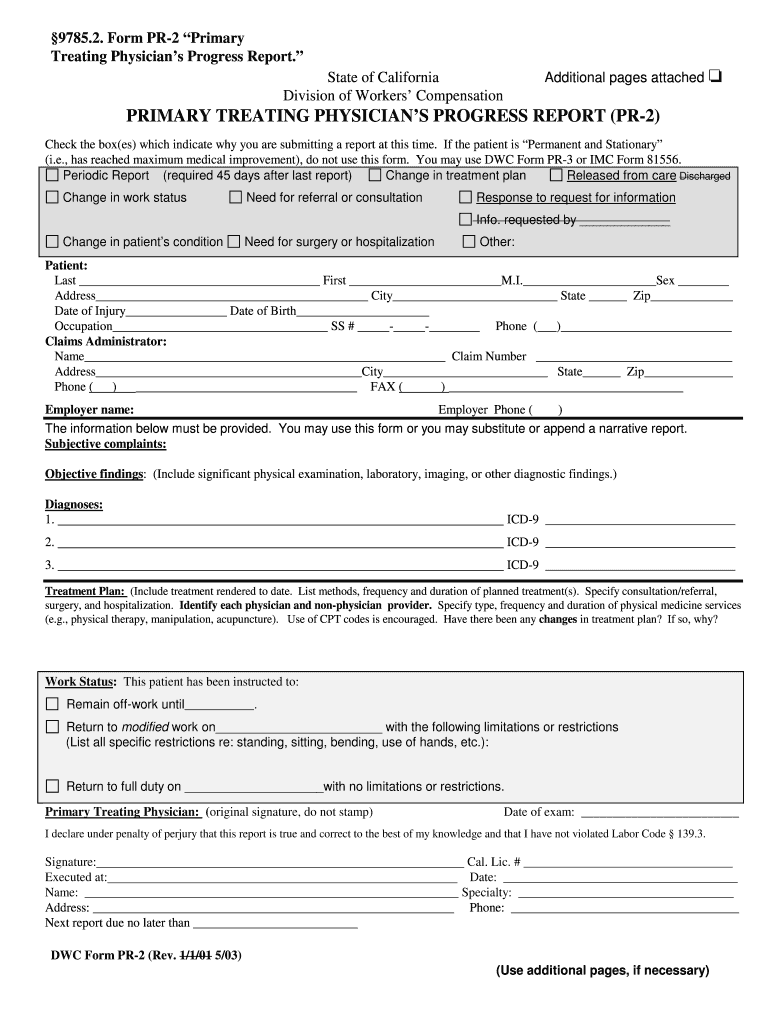 The California Primary Treating Physician's Progress Report, commonly known as the PR-2 form, plays a crucial role in workers' compensation cases. This form is designed for healthcare providers to document a patient’s treatment progress. It encompasses various sections, including patient information, treatment plans, and diagnosis details.