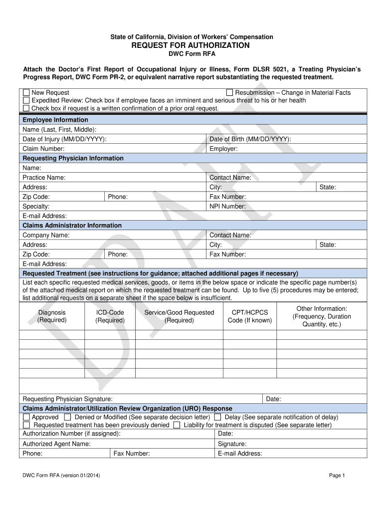 Creating a comprehensive Request for Authorization requires several essential documents to accompany the submission. These include the Doctor’s First Report of Occupational Injury or Illness (Form DLSR 5021) and the Treating Physician's Progress Report (DWC Form PR-2).