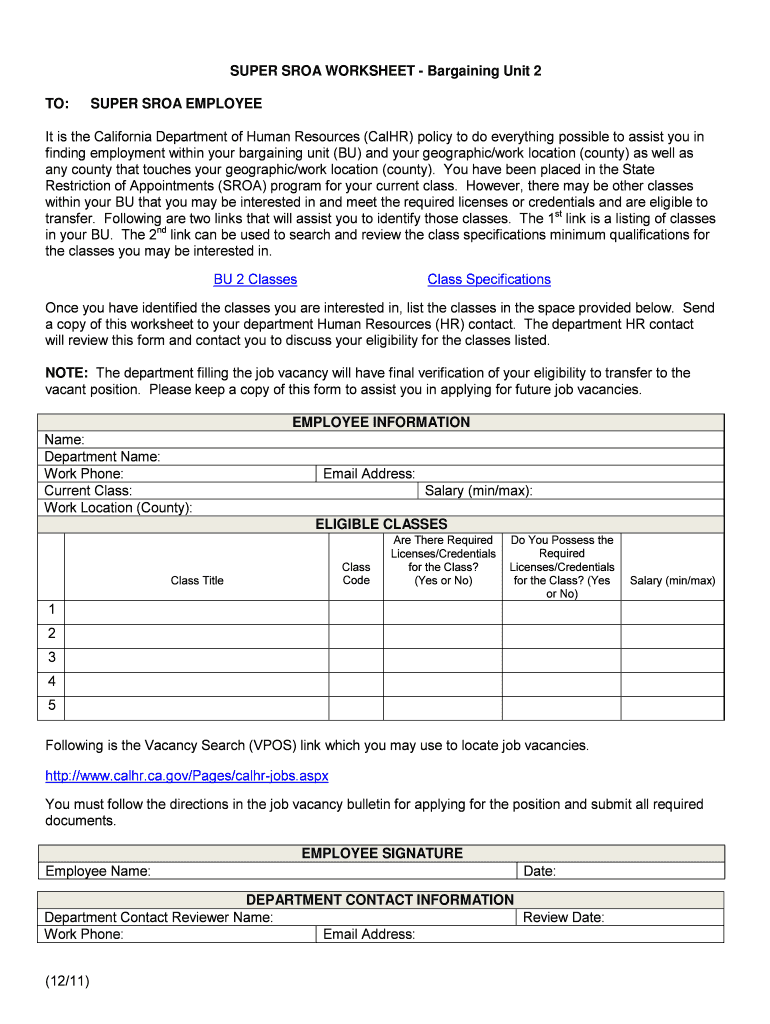 Employees in Bargaining Unit 2 who are enrolled in the State Restriction of Appointments (SROA) program and wish to transfer to eligible classes may fill out this worksheet.