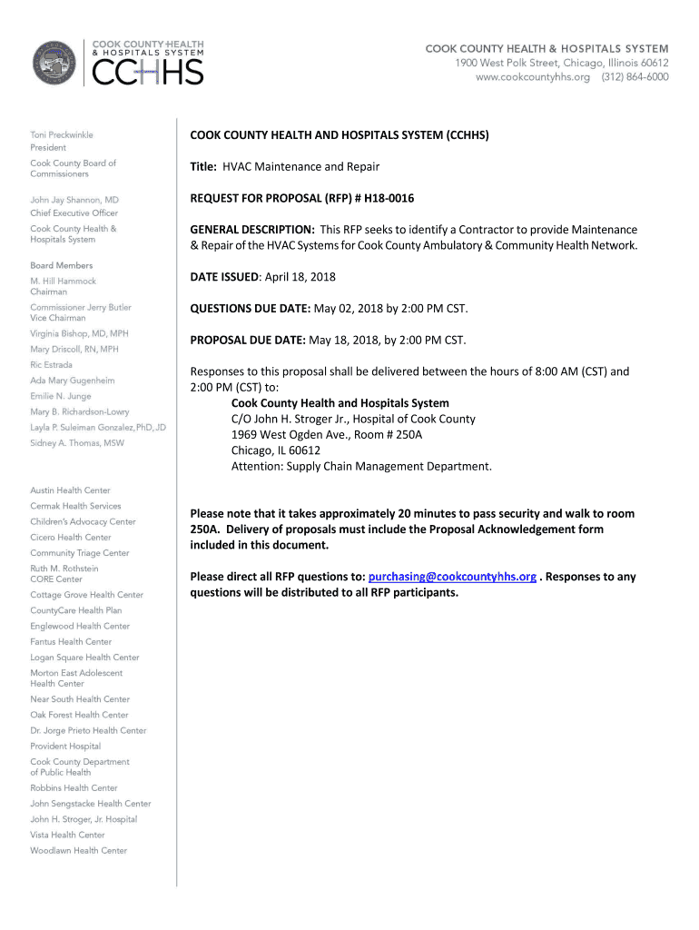COOK COUNTY HEALTH AND HOSPITALS SYSTEM (CC HHS) Title: HVAC Maintenance and Repair REQUEST FOR PROPOSAL (RFP) # H180016 GENERAL DESCRIPTION: This RFP seeks to identify a Contractor to provide Maintenance