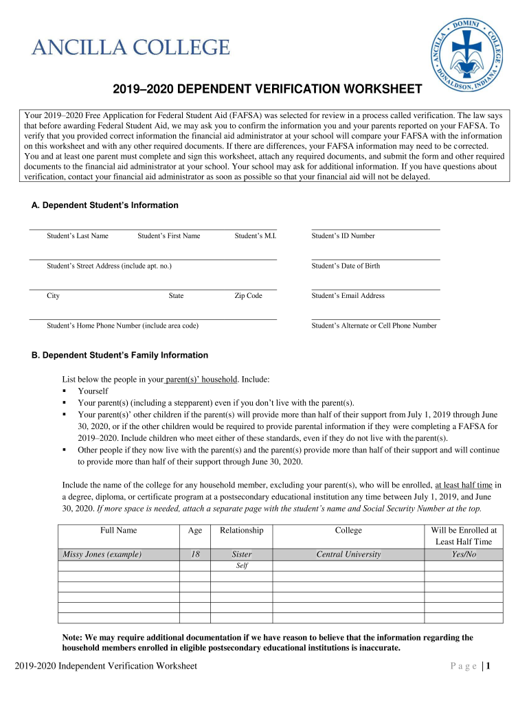 Get the free 2019-2020 Verification Worksheet Dependent Student Your ...