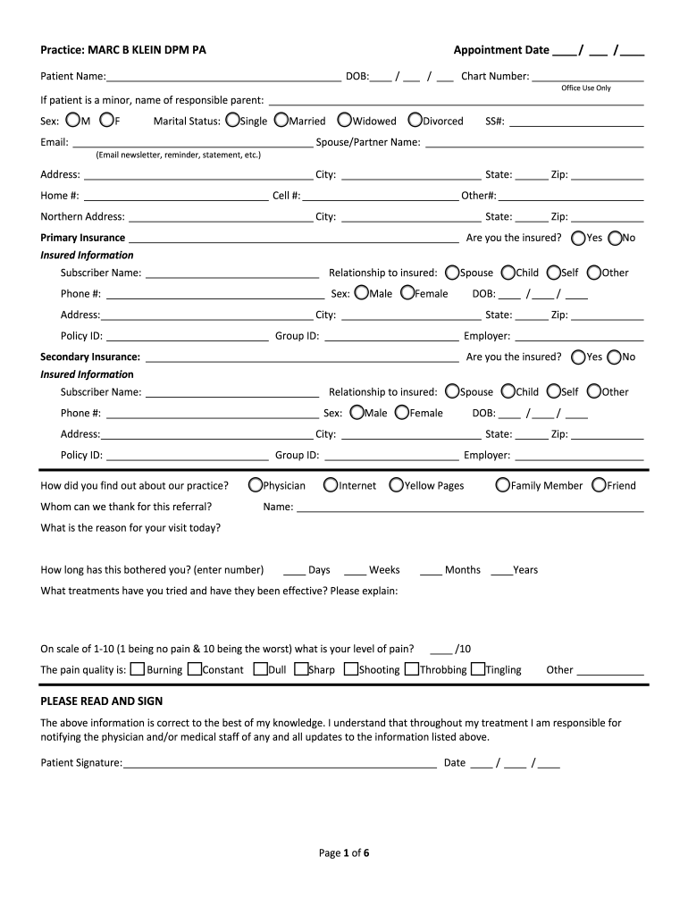 Practice:MARCBKLEINDPMPAAppointmentDate / / PatientName: DOB: / / ChartNumber: OfficeUseOnly Ifpatientisaminor, nameofresponsibleparent: Sex:MFMaritalStatus:SingleMarriedWidowedDivorcedSS#: Email: