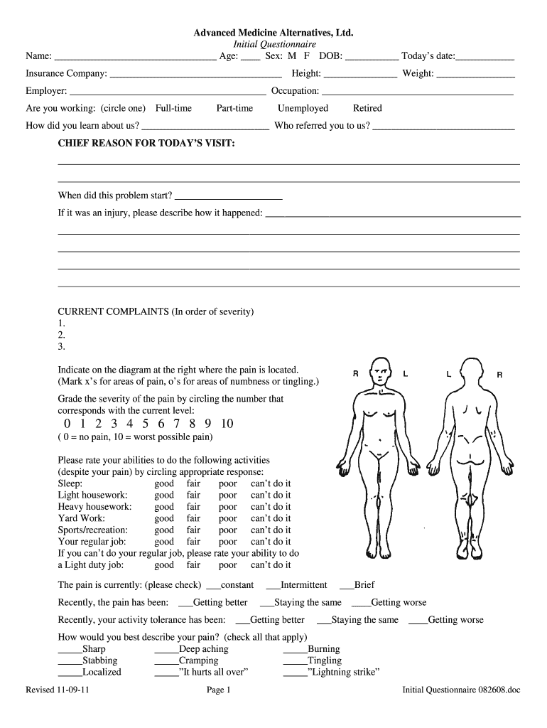Advanced Medicine Alternatives, Ltd. Initial Questionnaire Name: Age: Sex: M F DOB: Today's date: Insurance Company: Height: Weight: Employer: Occupation: Are you working: (circle one)FulltimeParttimeUnemployedRetiredHow