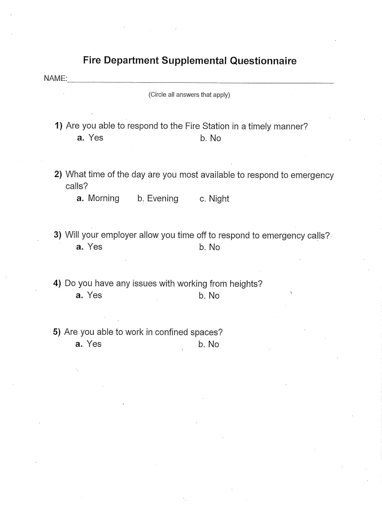 Fire Department Supplemental Questionnaire NAME: (Circle all answers that apply)1) Are you able to respond to the Fire Station in a timely manner? a. Yes. No2) What time of the day are you most available