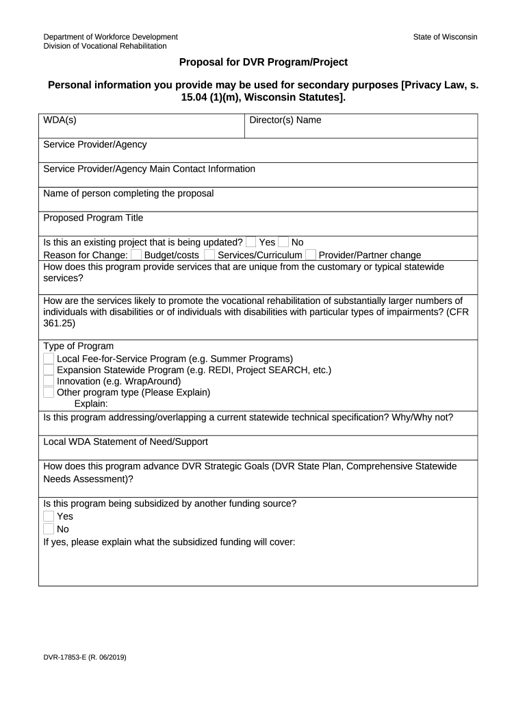 DVR-17853-E, Proposal for DVR Program/Project. This must be completed by WDA Directors when seeking approval for a new program or project. word template: frequently asked questions
