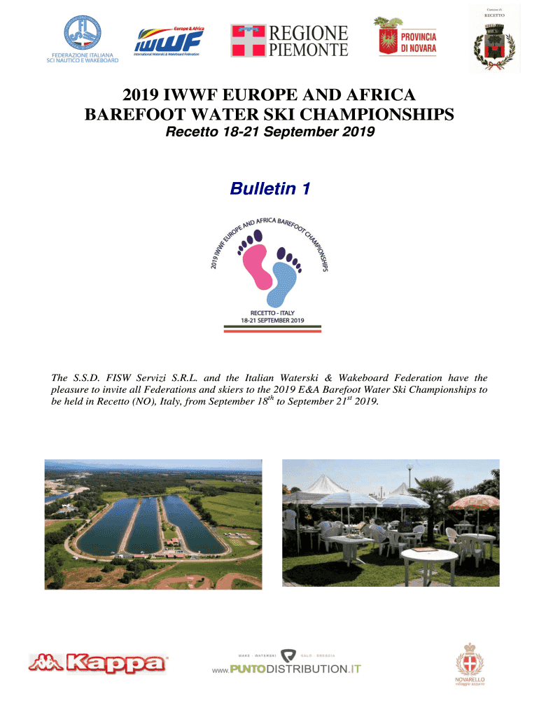 2019 WWF EUROPE AND AFRICA BAREFOOT WATER SKI CHAMPIONSHIPS Recent 1821 September 2019Bulletin 1The S.S.D. FISH Service S.R.L. and the Italian Water ski & Wake board Federation have the pleasure to