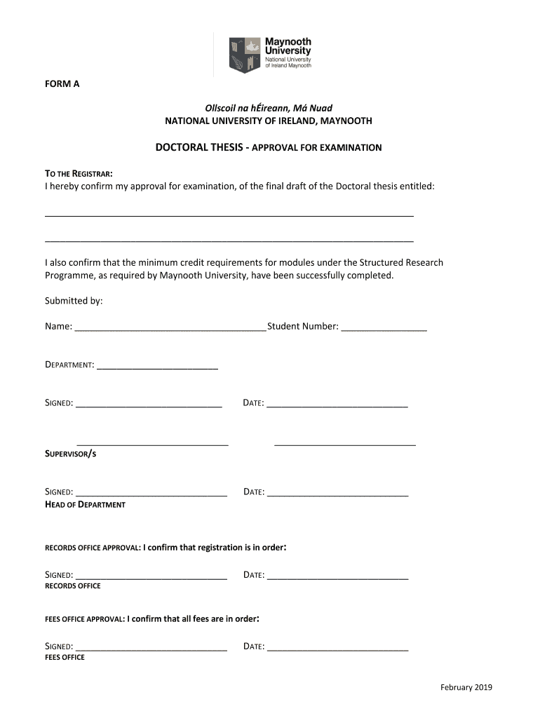 FORM A Ollscoil Na Hermann, M NAD NATIONAL UNIVERSITY OF IRELAND, MAYNOOTHDOCTORAL THESIS APPROVAL FOR EXAMINATION TO THE REGISTRAR: I hereby confirm my approval for examination, of the final draft