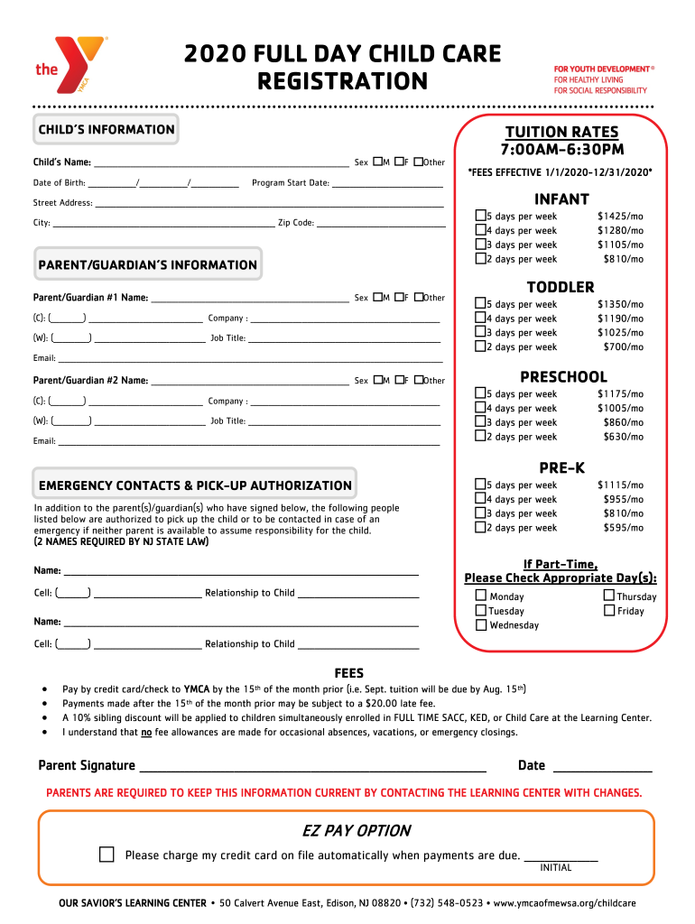 2020 FULL DAY CHILD CARE REGISTRATION CHILD INFORMATION Child's Name: Sex M F Other Date of Birth: / / TUITION RATES 7:00AM6:30PM *FEES EFFECTIVE 1/1/202012/31/2020×Program Start Date: INFANTStreet