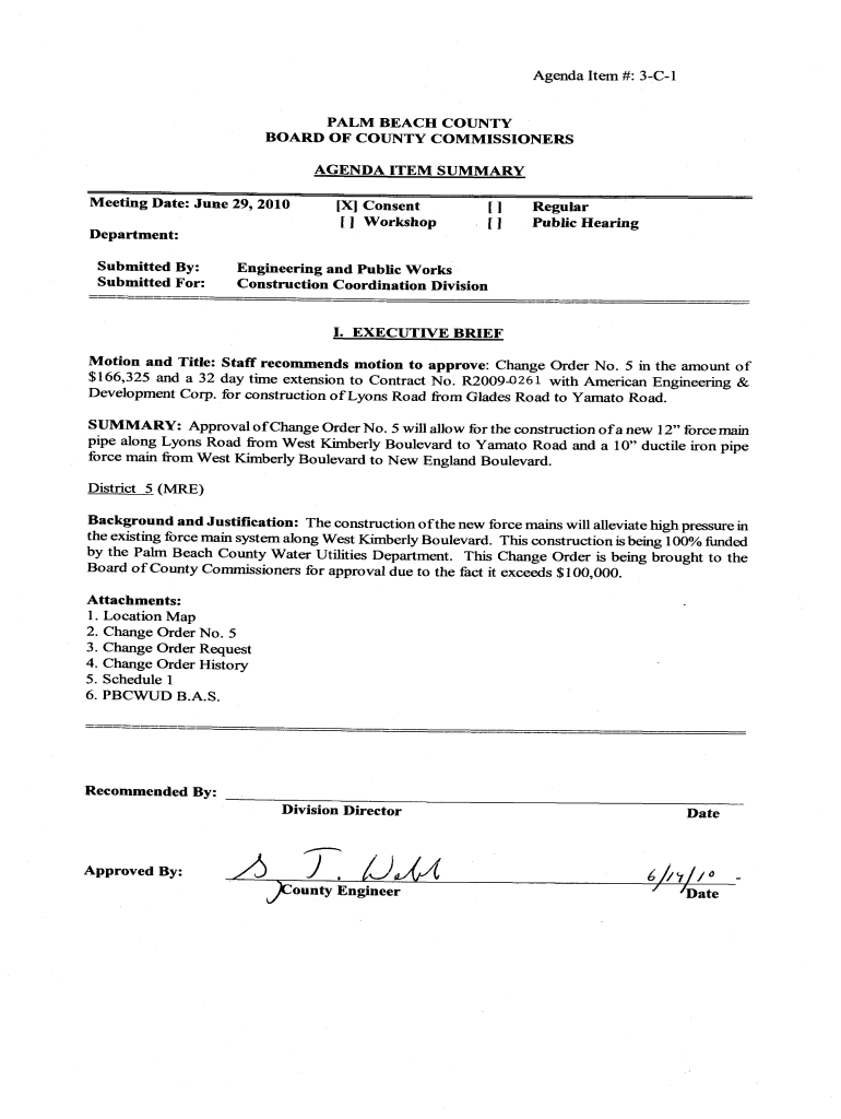 Agenda Item #: 3C1PALM BEACH COUNTY BOARD OF COUNTY COMMISSIONERS AGENDA ITEM SUMMAT RY Meeting Date: June 29, 2010, X Consent Workshop Department: Submitted By: Submitted For:Regular Public BearingEngineering