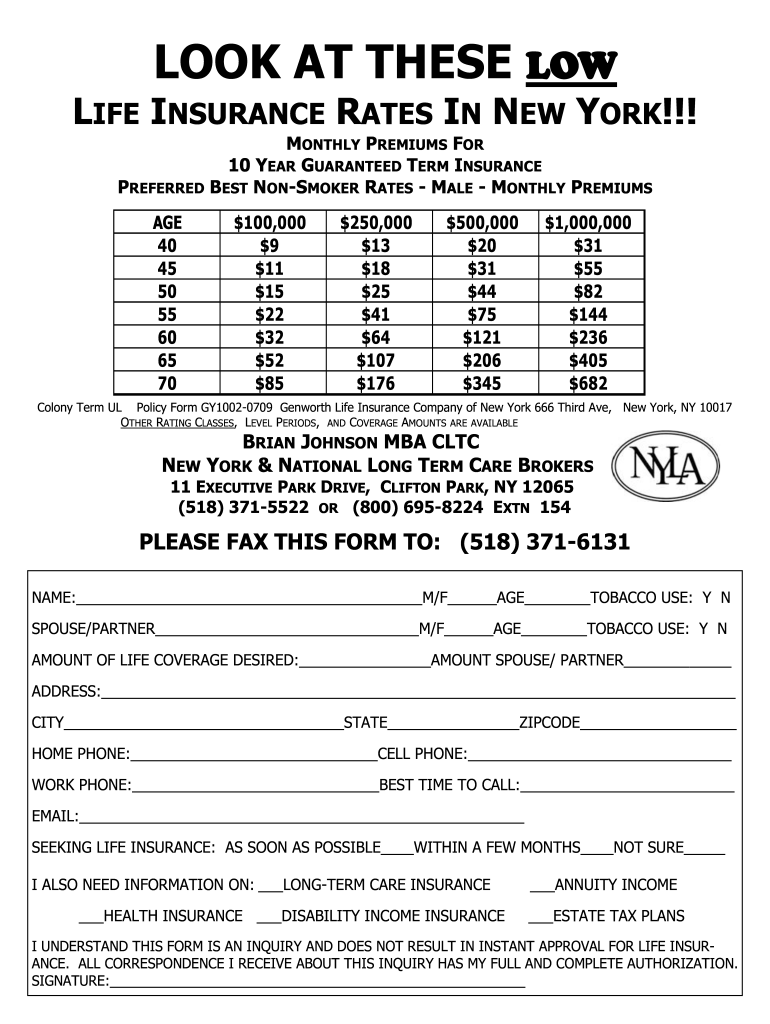 LOOK AT THESE LOW LIFE INSURANCE RATES IN NEW YORK!!! MONTHLY PREMIUMS FOR 10 YEAR GUARANTEED TERM INSURANCE PREFERRED the BEST NONSMOKER RATES MALE MONTHLY PREMIUMS AGE $40455055$$$606570100,000$$$$$911$$1522$$3252$$85250,000$$1318$$2541$$64107$$176500,000$$2031$$4475$$121206$$3451,000,000$315582144236405682Colony
