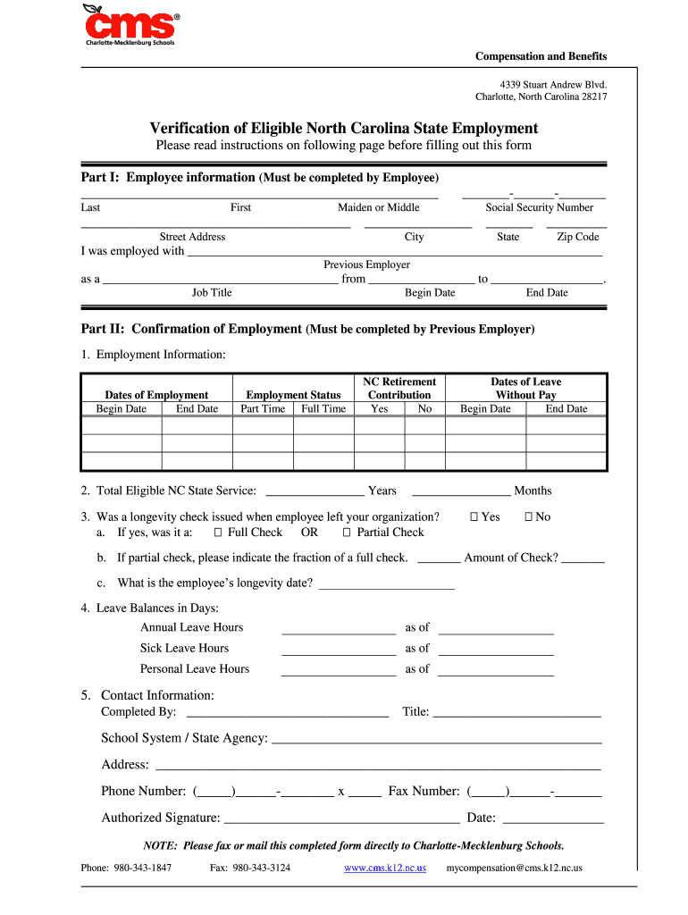 Compensation and Benefits 4339 Stuart Andrew Blvd. Charlotte, North Carolina 28217Verification of Eligible North Carolina State Employment Please read instructions on following page before filling