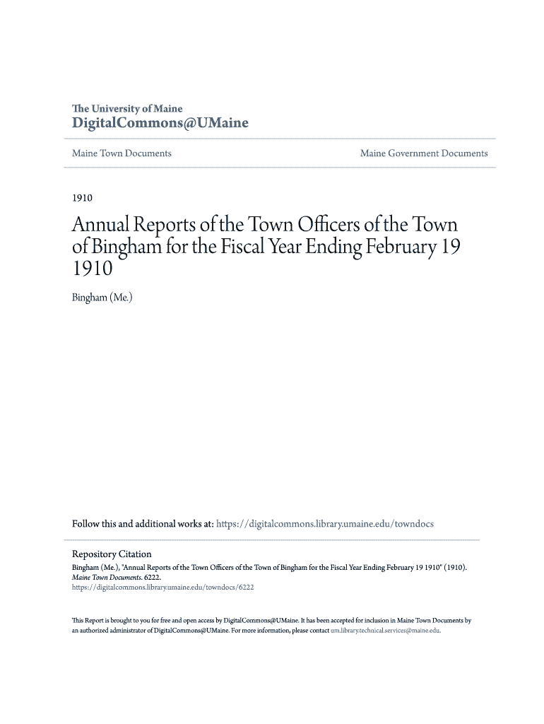 The University of MaineDigitalCommons Maine Town Documents Maine Government Documents1910Annual Reports of the Town Officers of the Town of Bingham for the Fiscal Year Ending February 19, 1910, Bingham