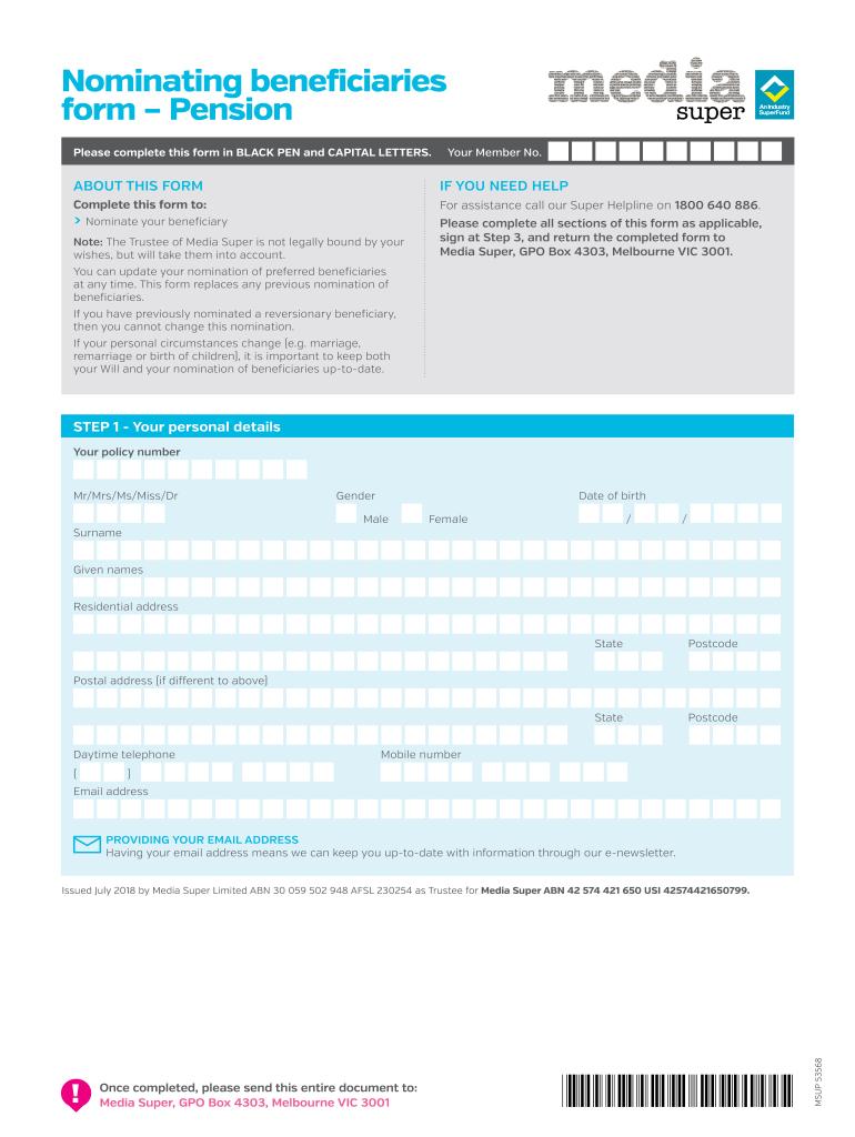 Nominating beneficiaries form Pension Please complete this form in BLACK PEN and CAPITAL LETTERS. Your Member No. ABOUT THIS FORMIC YOU NEED HELPComplete this form to:For assistance call our Super