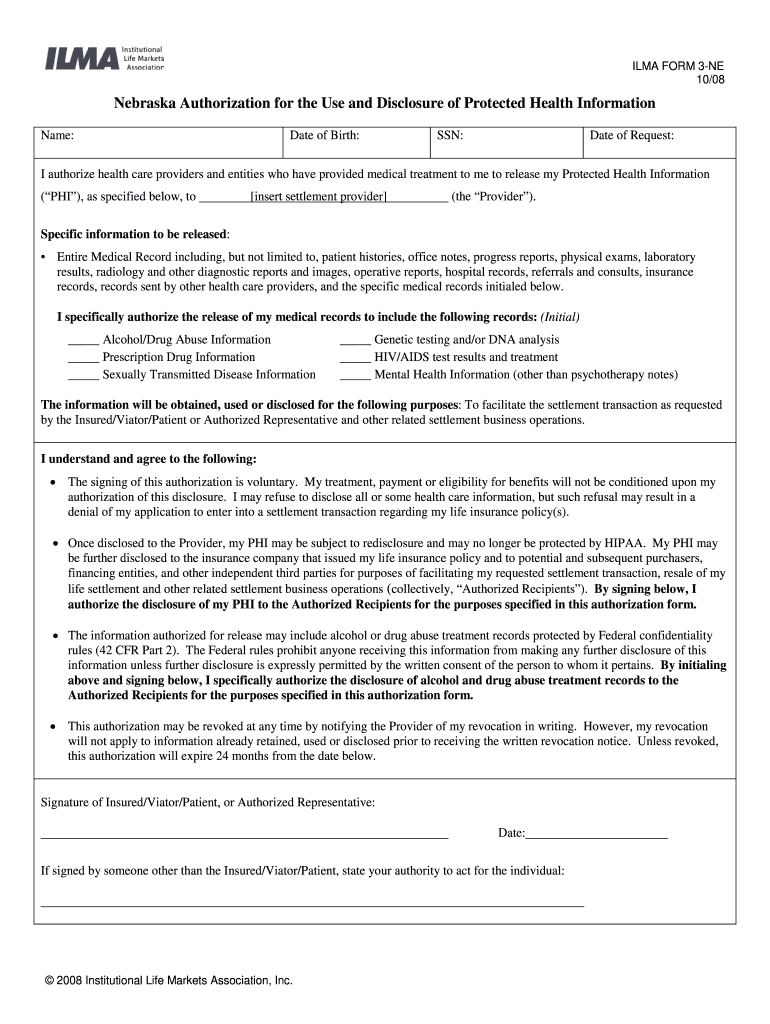 ALMA FORM 3NE 10/08Nebraska Authorization for the Use and Disclosure of Protected Health Information Name:Date of Birth:SSN:Date of Request:I authorize health care providers and entities who have