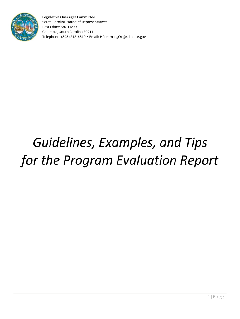 LegislativeOversightCommittee SouthCarolinaHouseofRepresentatives PostOfficeBox11867 Columbia,SouthCarolina29211 Telephone:(803)2126810Email:HCommLegOv house.gov Guidelines, Examples, antics fortheProgramEvaluationReport