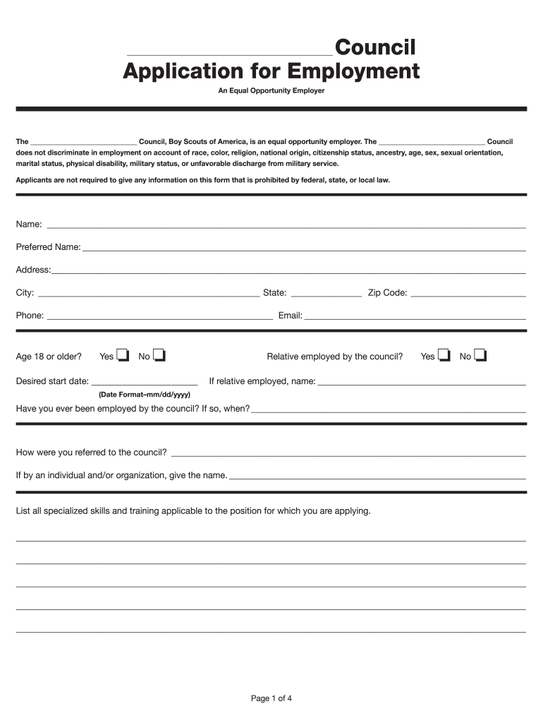 Council Application for Employment An Equal Opportunity Employee Council, Boy Scouts of America, is an equal opportunity employer. The Council does not discriminate in employment on account of race,