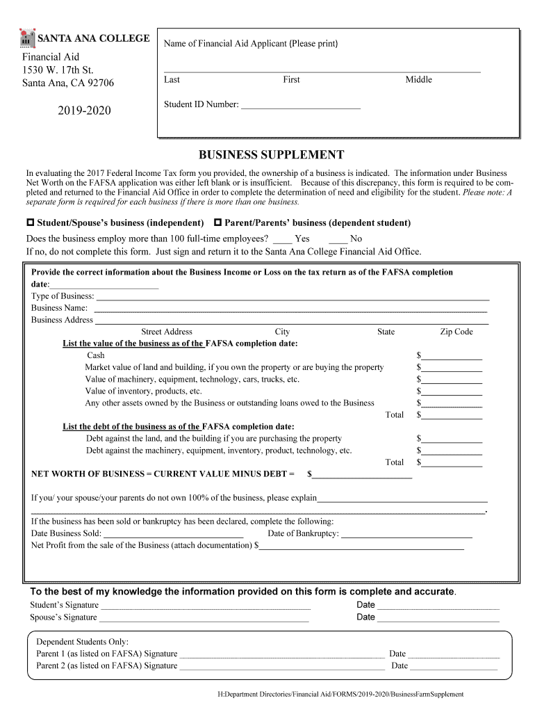 Name of Financial Aid Applicant (Please print)Financial Aid 1530 W. 17th St. Santa Ana, CA 9270620192020 Last First Middle Student ID Number: BUSINESS SUPPLEMENT In evaluating the 2017 Federal Income