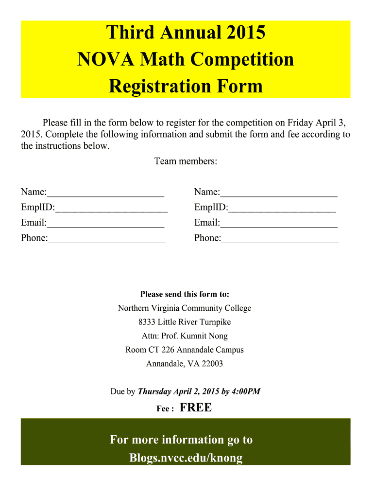 Third Annual 2015 NOVA Math Competition Registration Form Please fill in the form below to register for the competition on Friday, April 3, 2015. Complete the following information and submit the