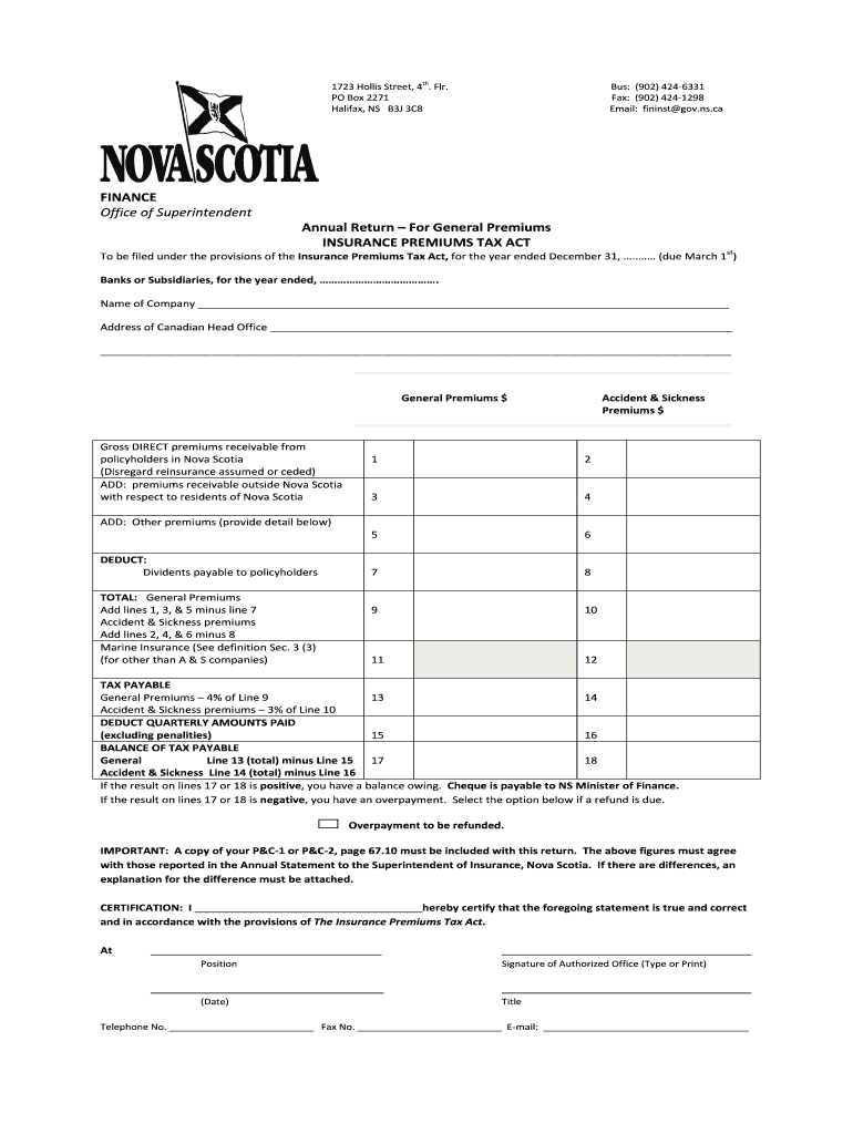 1723 Hollis Street, 4th. FLR. PO Box 2271 Halifax, NS B3J 3C8Bus: (902) 4246331 Fax: (902) 4241298 Email: fin inst gov.NS.finance Office of Superintendent Annual Return For General Premiums INSURANCE