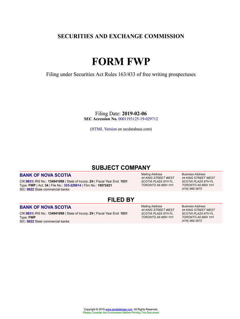 Get the free BANK OF NOVA SCOTIA Form FWP Filed 2019-02-06. Accession Number