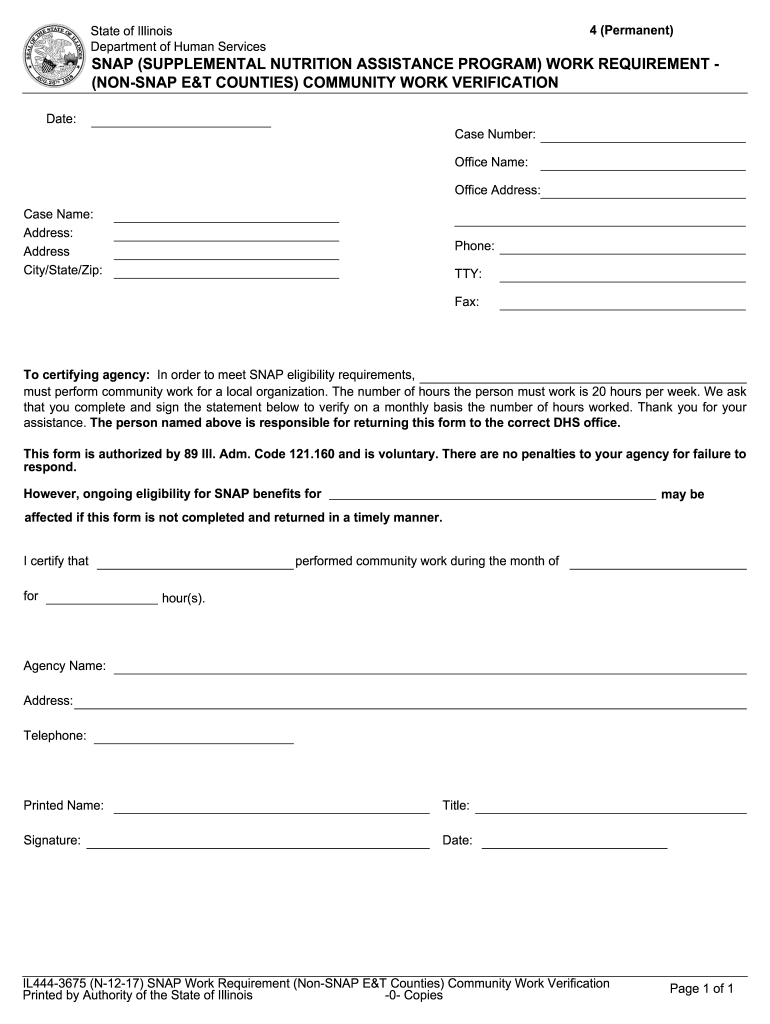4 (Permanent)State of Illinois Department of Human ServicesSNAP (SUPPLEMENTAL NUTRITION ASSISTANCE PROGRAM) WORK REQUIREMENT (NONSTOP E&T COUNTIES) COMMUNITY WORK VERIFICATIONDate:Case Number: Office