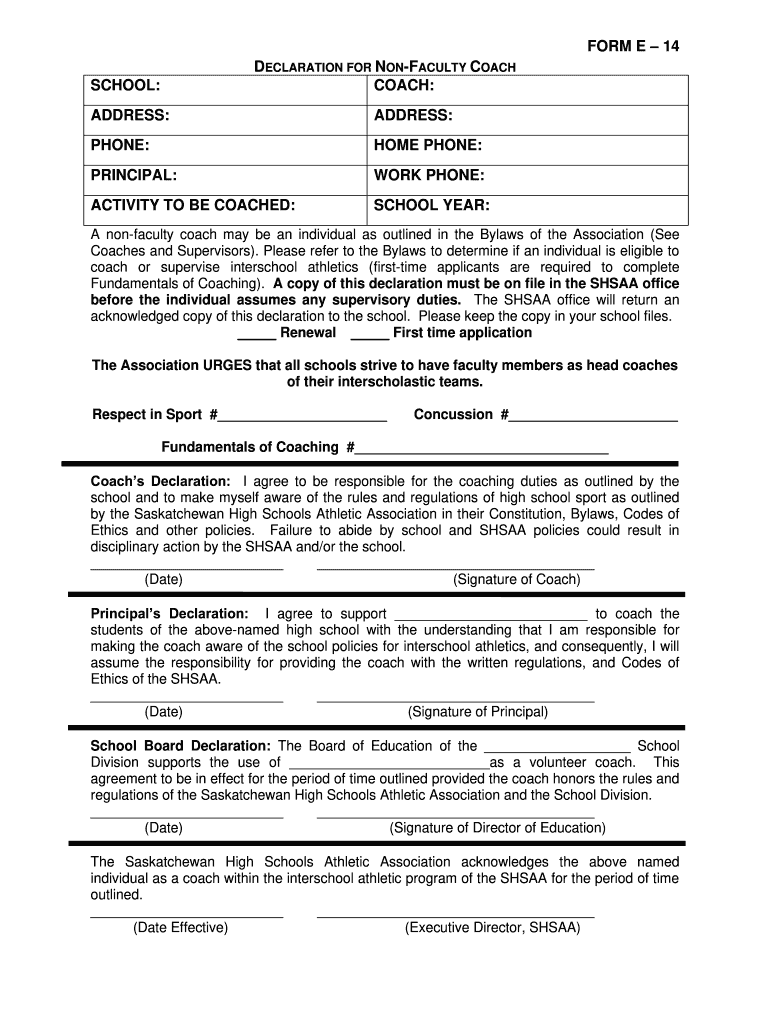 FORM E 14 DECLARATION FOR FACULTY COACH:SCHOOL: ADDRESS:ADDRESS:PHONE:HOME PHONE:PRINCIPAL:WORK PHONE:ACTIVITY TO BE COACHED:SCHOOL YEAR:A nonfaculty coach may be an individual as outlined in the