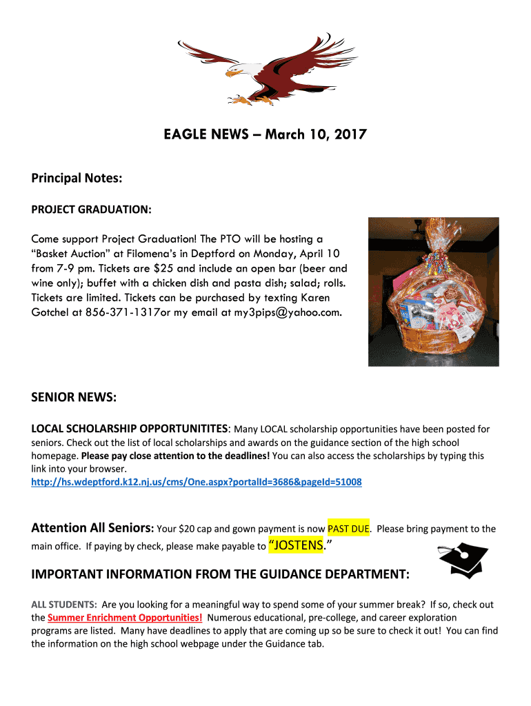 EAGLE NEWS March 10, 2017, Principalities: PROJECTGRADUATION: Come support Project Graduation! The PTO will be hosting a Basket Auction at Filaments in Dept ford on Monday, April 10 from 79 pm. Tickets