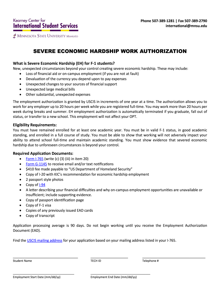 Phone 5073891281 Fax 5073892790 international MNS.severe ECONOMIC HARDSHIP WORK AUTHORIZATION What is Severe Economic Hardship (EH) for F1 students? New, unexpected circumstances beyond your control